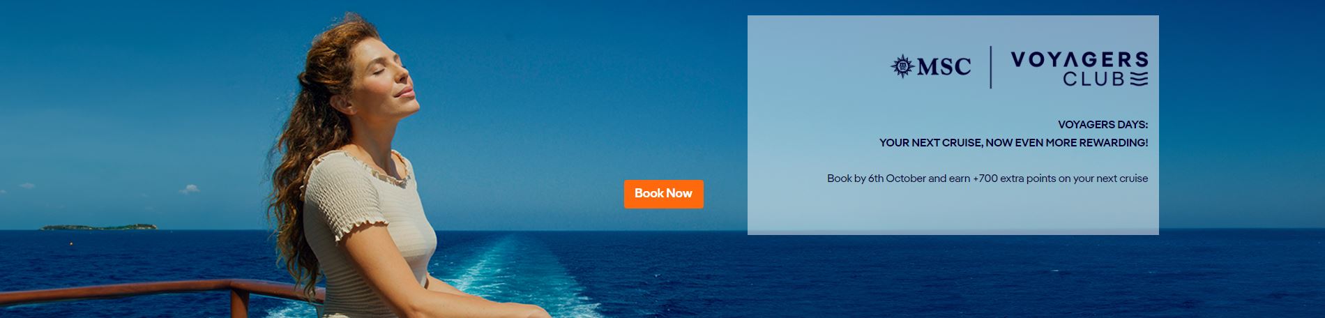 Dedicated to our MSC Voyagers Club members: extra points booking a Voyagers Exclusives cruise or World Cruises. Plus, all guests can earn 100 bonus points by updating their contact information up to 72h prior sailing and even more.